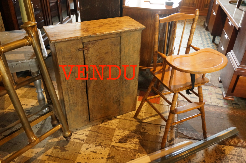 LIT 54 POUCES EN CUIVRE, HAUTEUR TÊTE: 54″, HAUTEUR PIED: 39″, 425$ * ENS. DE RAMPE ET BARREAUX, 225$ * ARMOIRETTE EN PIN, VENDU * TABLE ARGENT, CLOUS CARRÉS, 46″LARGEX30″PROFX27″HAUT, 75$ * LAVE-MAIN VERT, 29″LARGEX23″PROFX29″HAUT, 150$ * PETITES MARCHES, 120$ * GLACIÈRE EN CHÊNE, QUINCAILLERIES D’ORIGINE, INTÉRIEUR D’ORIGINE, 25″LARGEX20″PROFX53″HAUT, 925$ * CLASSEUR EN CHÊNE, FINI À PANNEAUX CREUX SUR LES CÔTÉS ET L’ARRIÈRE, 15″LARGEX29″PROFX52″HAUT, 625$ * TABLE EN PIN, 48″LARGEX30″PROFX30″HAUT, 350$ * BERÇANTE VERTE À BRAS, FAIT MAIN, 150$ * CHAISE-HAUTE, 30$