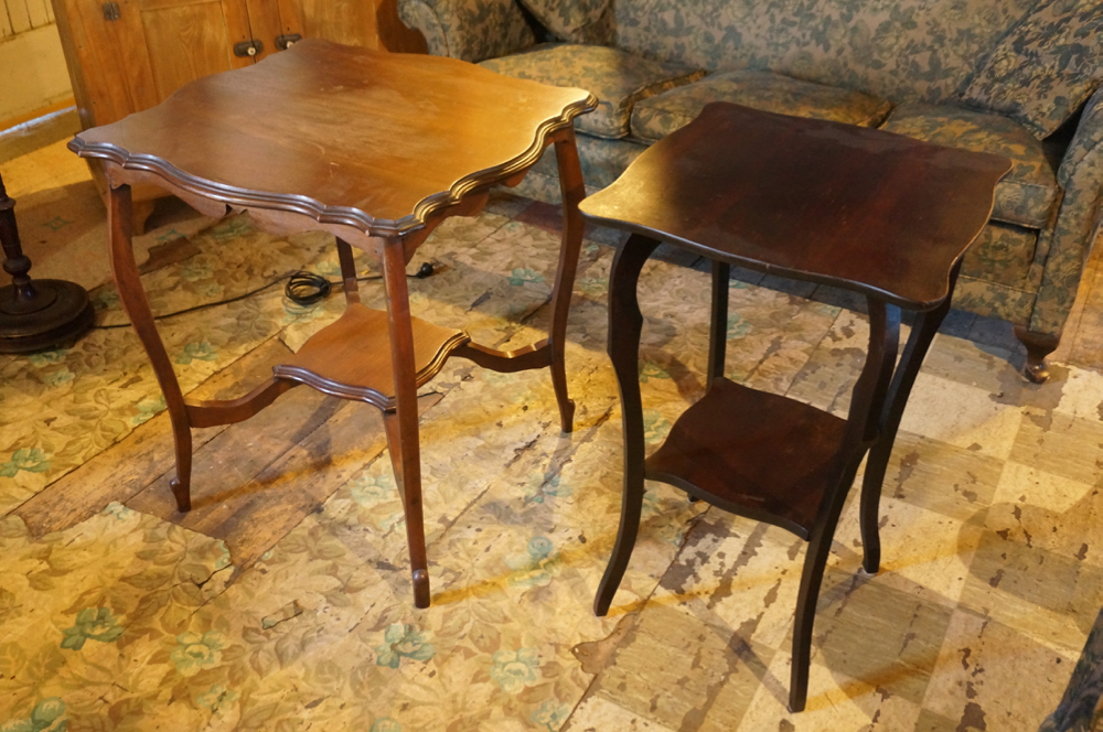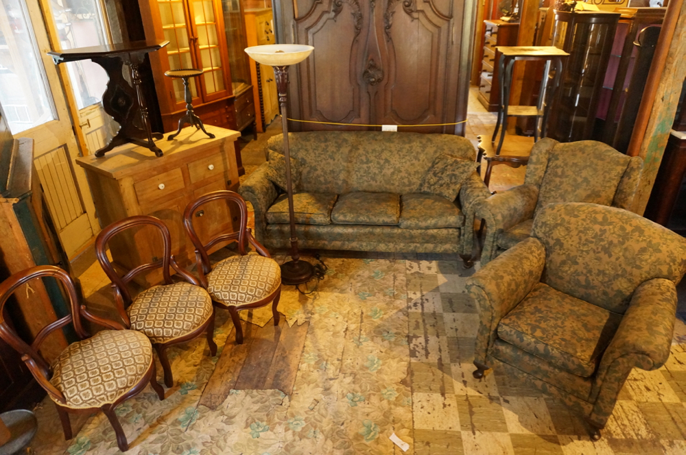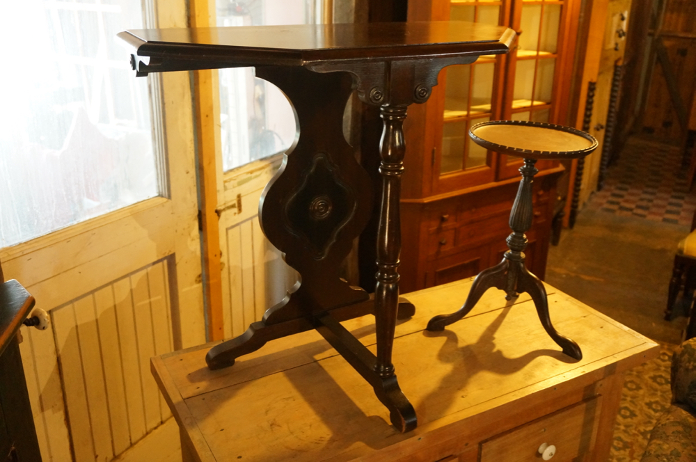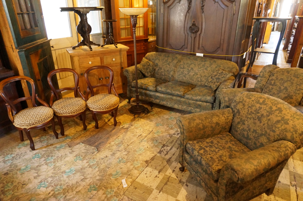BUFFET EN FRÊNE ET NOYER, FAIT MAIN, C1900, 40″LARGEX20″PROFX38″HAUT, 450$ * 3 CHAISES VICTORIENNES, FINI D’ORIGINE, C1900, 175$ CH * LAMPE TORCHÈRE, FONCTIONNELLE, 350$ * TABLE CONSOLE EN NOYER, FINI D’ORIGINE, 28″LARGE X 14″PROF X 26″HAUT, 200$ * TABLE À 3 PATTES, 35$ * TABLE DE SALON FONCÉE, 18″X18″X31″HAUT, 145$ * TABLE BRUNE, 26″X26″X29″HAUT, 165$ * ENSEMBLE DE SALON 3 MORÇEAUX, PIETEMENT QUEEN ANN, C1940, DIVAN 72″LARGE, FAUTEUILS 36″LARGE, 850$ L’ENS