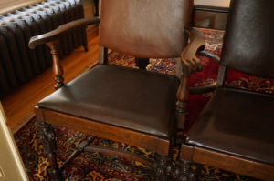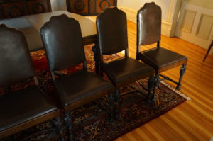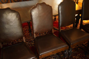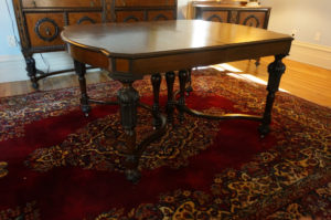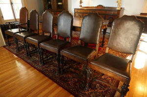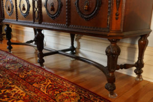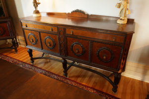 Magnifique ensemble de salle à manger 10 morceaux incluant buffet, vaisselier, desserte, table avec 5 allonges et 6 chaises, fini d’origine, noyer, richement sculpté, C1920 Grandeurs : Table 60″long x 47″large x 30″haut, possibilité de 100″long avec allonges Buffet 73″long x 43″haut x 22″prof Vaisselier 42″large x 73″haut x 19″prof Desserte 42″long x 33″haut x 19″prof